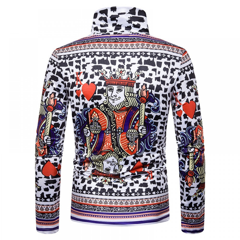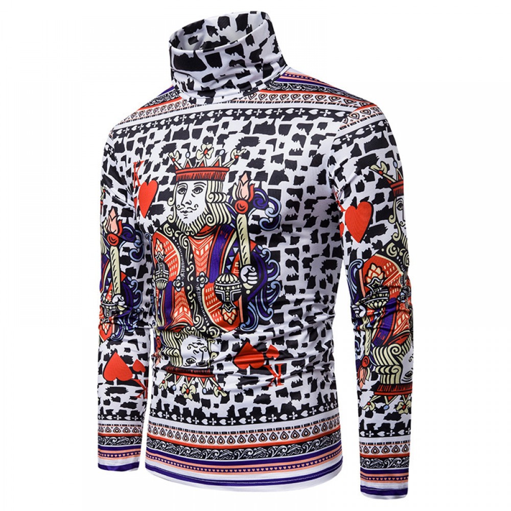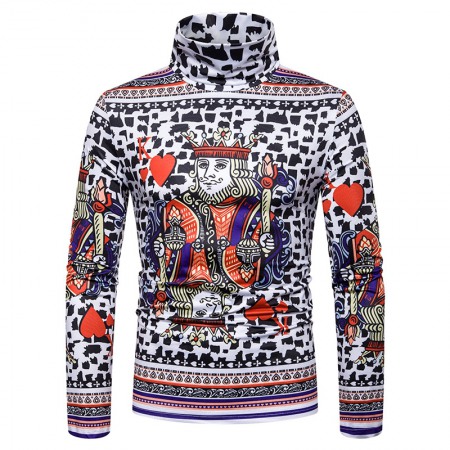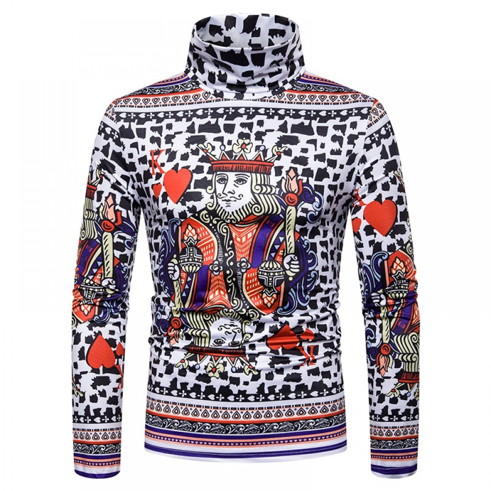 New Men's Large Size 3D Playing Cards Printing High Neck Long Sleeve T-Shirt Bottoming Shirt
