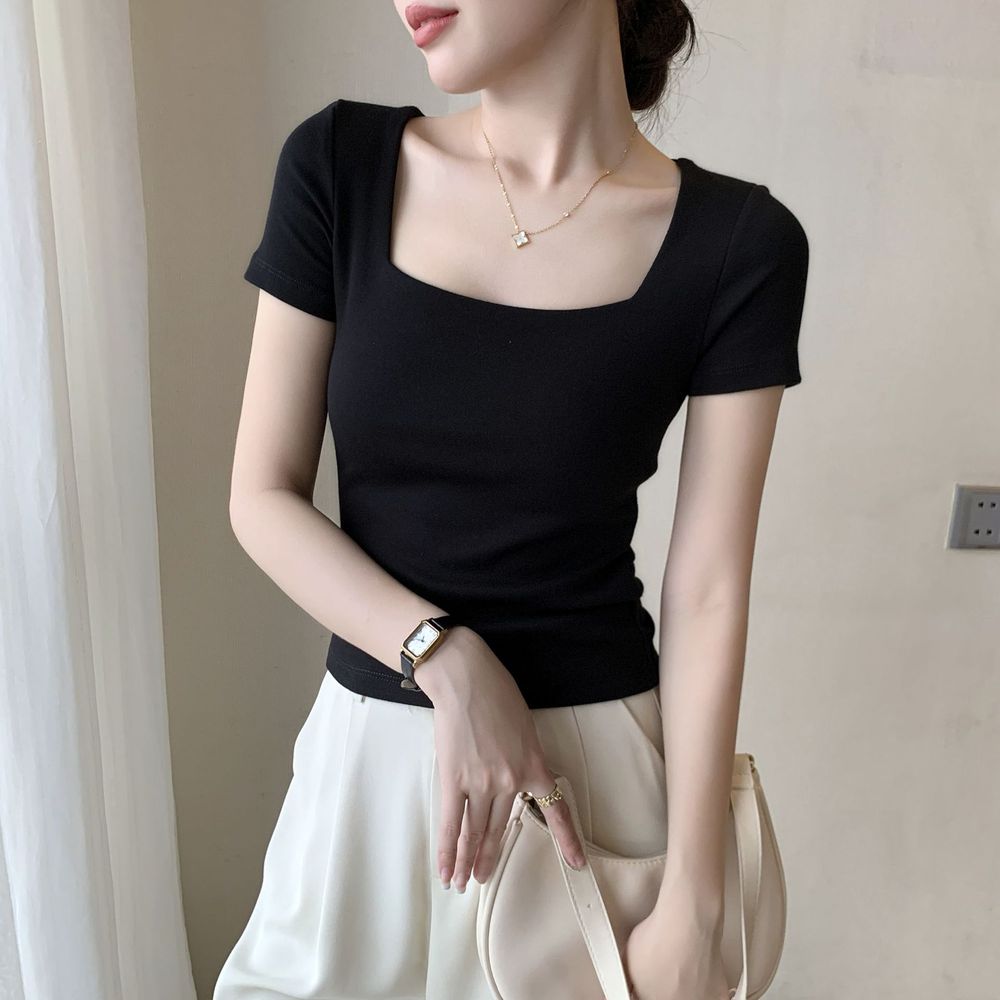 Square Neck Short Sleeve T-Shirt Slim Fit Cropped Top